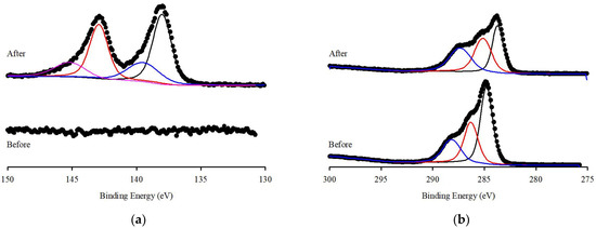 XPS spectra were evaluated to detect the functional groups present before and after the adsorption of Pb(II) ions onto S.P@Ca-SA. The wide scans of S.P@Ca-SA are depicted in Figure 5b; the characteristic peaks pre-adsorption at binding energies of 284.8, 399.1, and 531.4 eV are attributed to C1s, N1s, and O1s, respectively. Post adsorption of Pb(II), a new characteristic peak appeared at a binding energy of 138.3 eV, which was attributed to Pb 4f [44,45,46]. Compared with Pb(NO3)2, a lower binding energy of 139.6 eV for Pb 4f was observed, which was associated with the affinity of Pb(II) and S.P@Ca-SA [47]. The high-resolution spectra of N1s of S.P@Ca-SA are shown in Figure 6. The peaks at 399 and 400 eV were attributed to NH2 and NH3, implicating that Spirulina platensis successfully immobilized into alginate. After Pb(II) adsorption, the NH2 peak shifted to lower binding energies, indicating complexation between the NH2 groups and Pb(II). The peaks at 284.8, 286.4, and 288.0 eV in the C1s spectrum of S.P@Ca-SA were assigned to C-C, C-N, and O-C=O, respectively. The O1s spectrum exhibited peaks at 531.8, 532.5, and 533.4 eV, which were ascribed to C=O, C-O, and O-C=O, respectively. Compared with the XPS spectrum before Pb(II) adsorption, the spectra of both C1s and O1s demonstrated obvious changes after adsorption.