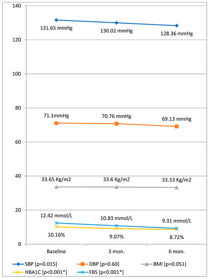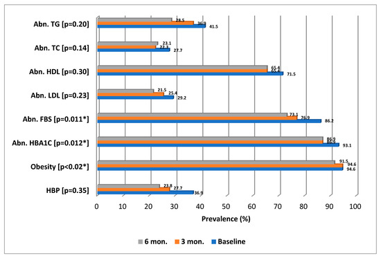 Cochran’s Q test for related samples was applied to test the change of prevalence of different clinical and laboratory parameters three and six months after education intervention. Figure 3 shows the significant reduction in the prevalence of abnormal HbA1c (p = 0.012), obesity (p = 0.018), and abnormal FBS (p = 0.011). However, there was no significant reduction in any of the prevalence of abnormal BP (p = 0.35), abnormal LDL (p = 0.23), abnormal HDL (p = 0.30), abnormal TC (p = 0.14), and abnormal TG (p = 0.20).