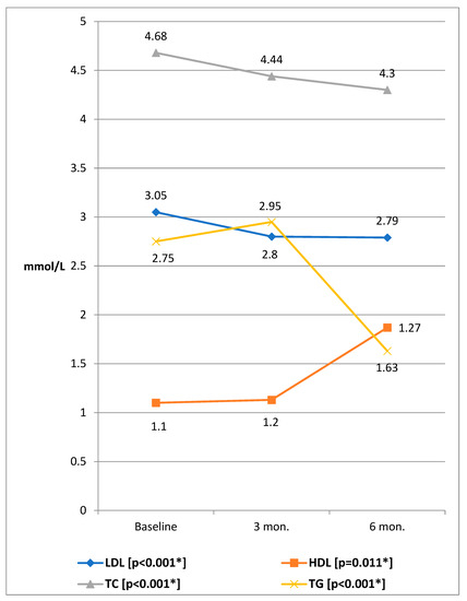 Figure 2 shows the laboratory indicators of participants at the baseline, three months, and six months of the intervention using the Friedman test for related samples. The results showed a significant reduction of HbA1c (χ2 = 97.57, p < 0.001), TC (χ2 = 25.87, p < 0.001), LDL (χ2 = 31.07, p < 0.001), TG (χ2 = 16.44, p < 0.001), and significant rise of HDL (χ2 = 9.10, p = 0.011). At 3 months, there was a significant reduction of TC (p < 0.001), LDL (p < 0.001), and TG (p = 0.009). At 6 months, significant reductions were retained for TC (p < 0.001), LDL (p < 0.001), and TG (p < 0.001). From three months to six months, significant improvement of only TG (p = 0.022) occurred, Table 2.