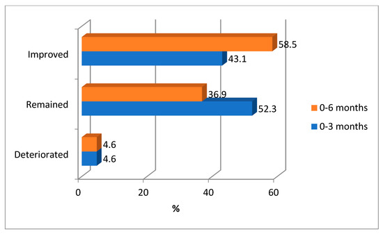 It has been reported that every 1% reduction in the mean level of HbA1c is associated with a 14% risk reduction of myocardial infarction, a 21% reduction in all Diabetes-related deaths, and a 37% and 43% reduction in microvascular complications and amputation risks, respectively [28]. Many studies and reviews have indicated that the optimal level of HbA1c, which should be aimed at, is 7% [29,30]. In this study, the number of participants with optimal HbA1c levels was almost doubled, as it was raised from 6.9% (93.1% abnormal HbA1c levels) at the baseline to 13.1% (86.1% abnormal HbA1c levels) at three months and this figure was maintained at six months of intervention (Figure 3). This demonstrated the benefits of this approach both in short and intermediate terms. At 6 months of this education intervention, a significant reduction in the prevalence of abnormal HbA1c (p = 0.0.012) was noticed, and the mean HbA1c was reduced by 1.5%. This finding was similar to the result of a previous study in a similar setting in Kuwait [31], where patients that received diabetes self-management education (DSME) sessions demonstrated better diabetes control with an average reduction of 1.3% HbA1c over 12 months compared to an average HbA1c increase of 1.1% in the control group (p < 0.001). Meanwhile, 43.1% and 58.5% of patients showed improvement in HbA1c levels at three and six months after intervention (Figure 4). However, it is necessary to note that improvement does not mean reducing HbA1c levels to normal levels but only reducing them to lower levels. Generally speaking, in our study, the number of patients with optimal glycemic control was almost doubled, in addition to the other reported metabolic benefits.