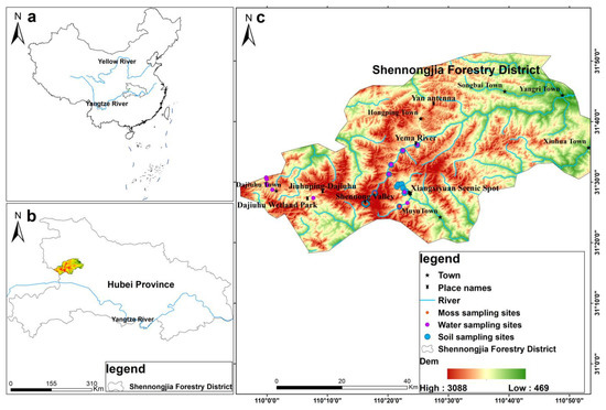 Shennongjia (SNJ) forestry district is an alpine/subalpine forest ecosystem in central China that is sensitive to global changes and metal(loid)s pollution [18]. As the ecological fortress of central China, SNJ is an important water source for China’s South-to-North Water Diversion Project (SNWD) and plays an important ecological role in maintaining the balance of the central Yangtze eco-region [19,20]. With the development of China’s economy and SNJ tourism, the SNJ alpine ecosystem is facing potential metal(loid) pollution problems [20,21,22]. The research of metal(loid)s in the SNJ alpine critical zone is important for understanding the geochemical distribution patterns and the pollution levels of metal(loid)s in the alpine ecosystem of central China, as well as the protection of the regional ecosystem and water source.