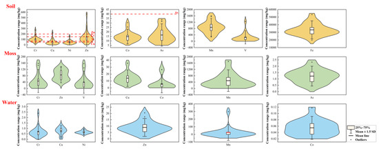 Violin diagram of selected metal(loid) contents in SNJ soil, moss, and water.