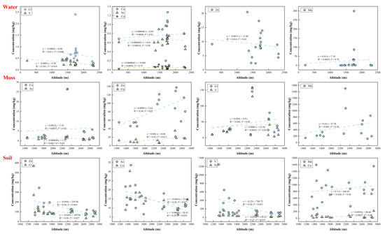 The distribution of SNJ soil, moss, and water metal(loid) contents with altitude. (The dashed lines represent the linear regression of data.)