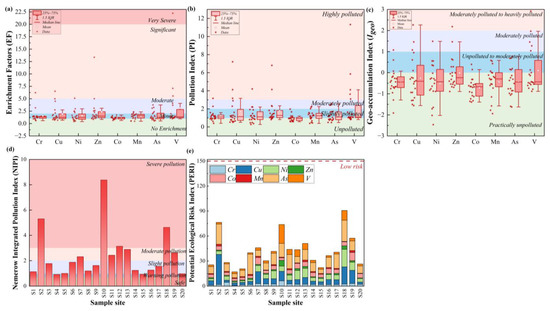 The enrichment factors (EF) (a), pollution index (PI) (b), geo-accumulation index (Igeo) (c), Nemerow integrated pollution index (NIPI) (d), and potential ecological index (PERI) (e) of metal(loid)s in SNJ soil.