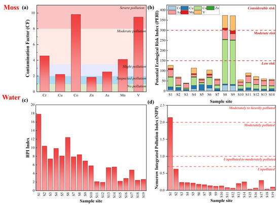 The contamination factors (CF) (a) and potential ecological risk index (PERI) (b) of metal (loid)s in SNJ moss; the HPI index (c) and the Nemerow integrated pollution index (d) of metal(loid)s in SNJ water.