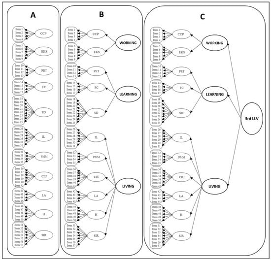 In Model 2, three upper latent variables were assumed as the first two subscales representing working skills; the next three represented living skills, and the last six subscales represented living skills. Examining the fit of Model 2 would help in understanding if there is support to have an overall mean on these three second-order latent variables (working, learning, and living). For example, researchers and practitioners would be supported to calculate means of working, learning, and living. In the last model, Model 3, it was assumed that there is a third-order latent variable that would examine if there is support to have an overall mean of all items (57 items) in the scale. If Model 3 fits the observed data, that means that calculating a mean score on the 57 items would be supported. All three hypothetical models are shown in Figure 1.