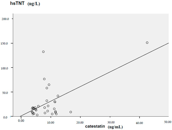 We found a significant positive correlation between serum CST levels and C-reactive protein (r = 0.423; p = 0.008), D-dimers (r = 0.395; p = 0.013), hsTNT (high-sensitivity troponin T) (r = 0.603; p < 0.001), proBNP (N-terminal pro-brain natriuretic peptide) (r = 0.569; p < 0.001), and hospitalization days (r = 0.388, p = 0.014). The correlation between high-sensitivity troponin T and catestatin serum concentration is demonstrated in Figure 2 as a linear regression plot and is presented alongside its calculated regression equation.