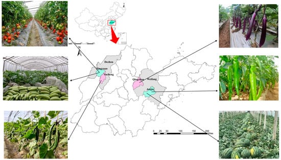 The local Bureau of Agriculture and Rural Affairs provided the information on the villages for a sample framework, from which we first selected those villages to implement greenhouse vegetable production. Then, we randomly selected 5 villages from each of the four counties. Overall, 20 households from each village were randomly selected according to the list provided by the village committee. Eventually, a total of 318 valid questionnaires were obtained. The questionnaire included the following: basic household operating conditions, vegetable planting area, input, output and farmers’ cognition of OSCF, etc. There are more than 10 vegetable crops, such as cucumbers, gourds, peppers and tomatoes, produced in the study areas (Figure 2). The content of the questionnaire was modified repeatedly, and the interviewers were also revised by the research group to ensure the scientific nature of the study and the reliability of the data.