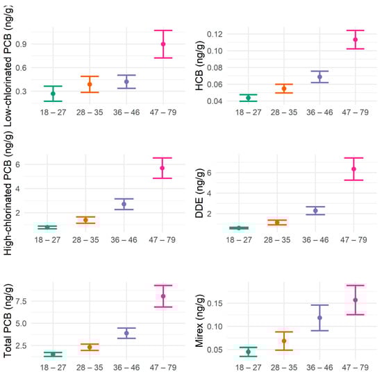4.2. Exposure Route for PCBs, HCB, DDE, and Mirex