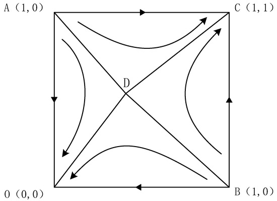 From Table 3, we know that the points (0,0), (1,1) are local equilibrium points when the cost amortized by the resident or the enterprise is greater than the default penalty paid by each but correspond to different strategies, (cooperation, cooperation), (non-cooperation, non-cooperation), respectively. The points (0,1), (1,0) are local instability points, is the saddle point, and the evolutionary phase diagram is shown in Figure 2.