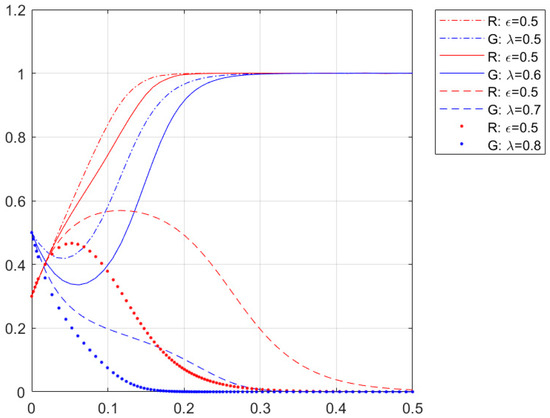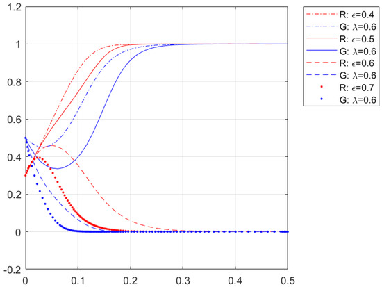 Figure 3 shows the simulation of changes in separation facilities’ distributivity on the residents’ enterprises’ willingness to cooperate, with other parameters constant. From Figure 3, the critical value of the distributivity of separation facilities λ is between 0.6 and 0.7. When the distributivity of separation facilities λ is less than this critical value, at this time, due to the low initial cooperative willingness of residents, the collective willingness of enterprises will have a slight decline. However, the residents and enterprises will eventually tend to cooperate and converge (1,1). At this time, the decrease of λ makes the cooperative willingness curve of residents and enterprises converge faster; when the distributivity of separation facilities λ is more significant than this critical value, at this time, the initial cooperative willingness of enterprises is higher. The collective willingness of residents is faster. When the distributivity of facilities λ is greater than the critical value, the initial willingness of enterprises to cooperate is higher, the willingness of residents to cooperate will rise slightly, and finally, the willingness of residents and enterprises to cooperate converges to (0,0), i.e., both residents and enterprises choose “non-cooperation”, at this time, the increase in the distributivity of separation facilities λ makes the cooperation curve of residents and enterprises converge to (0,0). This is since the cost paid by the enterprises’ side gradually increases as the distributivity of separation facilities increases in the game process. The simulation results show that when the complexity of separation facilities is certain, the lower the distributivity of separation facilities, the stronger the willingness to cooperate between residents and daily cleaning companies in Dongcheng District, Beijing streets.