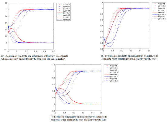 Figure 5c shows the simulation of decreasing separation facility distributivity λ and increasing complexity ε on residential enterprise cooperation in residential enterprise waste separation cooperation with other parameters. From Figure 5c, the critical values of simultaneous changes in the distributivity of separation facilities λ and complexity ε are 0.4–0.5 and 0.6–0.7, respectively. When the distributivity of separation facilities λ is more significant than this critical value and complexity ε is less than this critical value, at this time, due to the low initial willingness of residents to cooperate, the enterprises’ willingness to cooperate experiences a slight decline, and finally the residents and enterprises tend to choose the “cooperation” strategy, the equilibrium point converges to (1,1). At this time, the decline of separation facilities λ and the rise of complexity ε make the cooperation curve of residents and enterprises converge to (1,1) faster; when the distributivity of separation facilities λ is less than the critical value and complexity ε is greater than the critical value, at this time, because the initial willingness of enterprises to cooperate is high, the willingness of residents to cooperate experiences a slight increase. Finally, at this time, when the distributivity of facilities λ and the complexity ε are higher than the critical value, the residents’ willingness to cooperate tends to choose the “non-cooperation” strategy, and the cooperation curve of residents converges to (0,0). This indicates that as the distributivity of separation facilities λ decreases and complexity ε increases, the choice of residential enterprises gradually shifts from “cooperation” to “non-cooperation” as a result of when the distributivity of separation facilities is high but complexity is not high. When complexity is not high, the cost of using and maintaining residential enterprises is also low. When the distributivity of separation facilities is high, although the enterprises have to pay certain hardware costs, the complexity of separation facilities is not high. The use and maintenance costs are low, so the residents and the enterprises can gain a lot. However, when the distributivity of separation facilities is not high, and the complexity is high; the higher the complexity, the higher the cost of cooperation between residents and enterprises, and the more difficult it is to cooperate. According to the simulation, when the distributivity of separation facilities decreases and the complexity increases, the willingness of residents and daily cleaning companies to cooperate in Beijing’s Dongcheng District decreases.