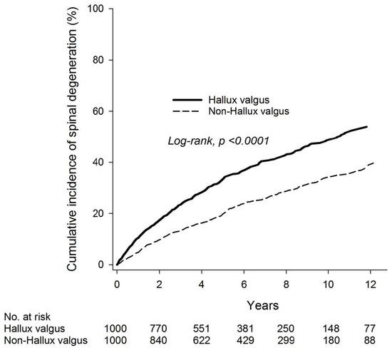 To further evaluate the effect of the surgical intervention, our result (Table A2) demonstrated an increased risk of spinal degenerative change for those in the hallux valgus group without surgical intervention (aHR = 1.95, 95% CI = 1.66–2.99, p < 0.001).