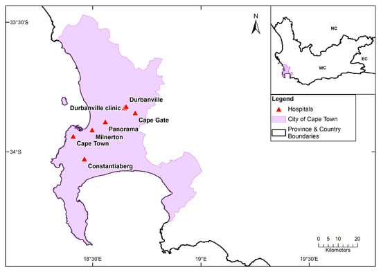 A list of potential private hospitals that were included in this study was obtained from the Hospital Association of South Africa (HASA) website (https://hasa.co.za/, accessed on 30 June 2019). Only seven private hospitals located in the City of Cape Town, South Africa, were included in this study due to the availability of data (Figure 1).