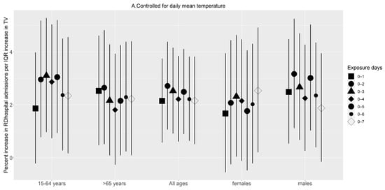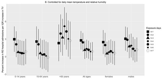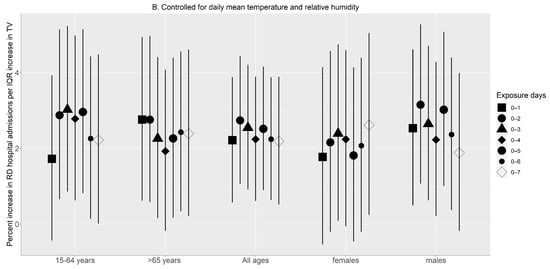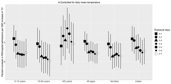 Further controlling the models for the effects of daily mean temperature, the highest effect estimates for the entire study group appeared at different exposure days. The highest effect estimates appeared at 0–2 days for CVD hospitalisation (Figure 3A) and at 0–1 day for RD hospitalisation (Figure 4A). After reaching the maximum, the effect estimates of TV on hospitalisations for both diseases tended to be stable and then decreased. The subgroup analysis showed that the 15–64 age group was more vulnerable to CVD hospitalisations and the 65 or older age group was more vulnerable to RD hospitalisations. Similar patterns Figure 4A,B were observed after controlling for all other covariates, including relative humidity.