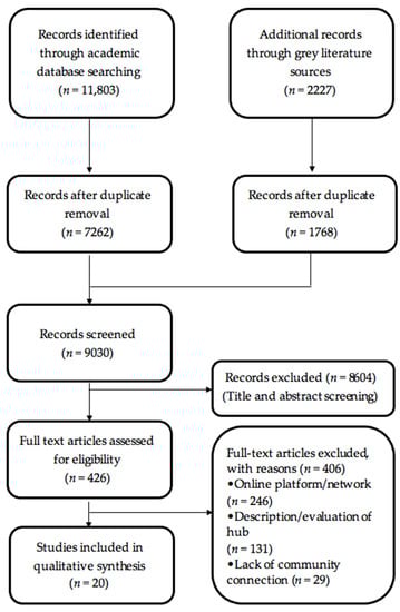 The remaining 426 papers underwent a full-text review for eligibility by JB. During the full-text review, articles on online platforms/networks, articles describing or evaluating existing hubs (rather than developing new hubs), and articles without community connections or stakeholders were excluded, so that 20 studies remained for the complete qualitative analysis. We used a PRISMA flow chart to track the number of studies following each stage of exclusion (Figure 2) [21].
