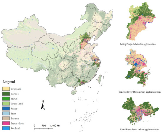 The BTH, YRD, and PRD UAs were selected as the research objects (Figure 1), among which the BTH UA includes 13 cities in the Beijing, Tianjin, and Hebei Provinces, with a total area of 218,000 km2, including three major geographical units: the northwest mountainous area, the southeast plain, and the eastern Bohai sea. The core area of the YRD UA includes 16 cities in Jiangsu Province, Zhejiang Province, and Shanghai City, with a total area of 131,000 km2. The cities are located in the lower reaches of the Yangtze River bordering the Yellow Sea and the East China Sea, and at the meeting place of the rivers and the sea. The region is characterized by many coastal ports along the river and the alluvial plain formed before the Yangtze River entered the sea. The PRD UA includes Guangzhou, Foshan, Zhaoqing, Shenzhen, Dongguan, Huizhou, Zhuhai, Zhongshan, Jiangmen, and nine other cities, with a total area of 55,500 km2. The cities are located in the south–central part of China’s Guangdong Province at the mouth of the Pearl River. The three major UAs account for around 5% of the country’s total land area and 33% of the population, but contribute nearly 44% of the country’s GDP [35]. The three major UAs are important regions for China’s economic development, and the study of the influencing factors of their NCSE can provide an important reference for China to formulate a dual carbon policy.