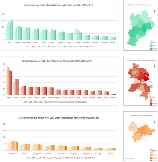In general, research on urban agglomerations (UAs) over long time series can help to reveal the key factors of NCSE differences among UAs. Beijing–Tianjin–Hebei (BTH), the Yangtze River Delta (YRD), and the Pearl River Delta (PRD), as the three most typical UAs in China, have important impacts on carbon emissions in China and even globally. Therefore, in this study, these three major UAs were selected as the research object, the temporal evolution and spatial distribution characteristics of CO2 emissions were analyzed, and the CSV and NCSE of the UAs during 2007–2019 were investigated by the STC model. A comparative analysis of the influencing factors of the NCSE was conducted based on the two-way fixed-effects model to explore the commonality and individuality of carbon revenues and expenditures among the three UAs.