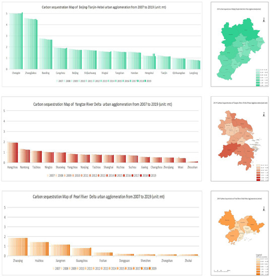 The carbon sequestration of the three major UAs from 2007 to 2019.