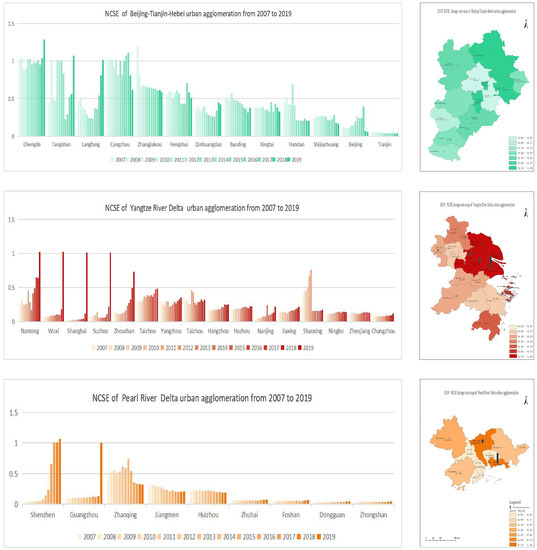 The NCSE values of the three major UAs from 2007 to 2019 were calculated according to Equations (4) and (5). Figure 4 reveals that only four cities in the BTH UA presented an increase in NCSE in 2019 as compared to 2007, among which Tangshan and Langfang had the highest increases. In contrast, Beijing displayed the greatest decrease in NCSE as compared to 2007. Only Zhenjiang, Taizhou, and Shaoxing in the YRD UA presented decreases in NCSE in 2019 as compared to 2007. Shaoxing had the largest decrease, while Shanghai, Wuxi, and Suzhou had the largest increases. The NCSE values of Jiangmen, Zhaoqing, and Huizhou in the PRD UA were decreased in 2019 as compared to 2007, and that of Zhaoqing decreased the most. Shenzhen and Guangzhou were the two cities with the largest increases in NCSE in the PRD UA.