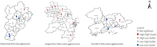 From Figure 5, it can be seen that the cities in the BTH UA with L–L clustering were mainly Beijing during 2009–2018 and Xingtai and Handan during 2015–2019, and the only city with H–H clustering was Chengde in 2017. Langfang presented multiple clustering patterns and spatiotemporal clustering during the entire study period. Nanjing, Suzhou, and their neighboring cities in the YRD UA showed a surge in NCSE values in 2019; these cities exhibited H–H spatiotemporal clustering and their neighboring cities presented L–H clustering. Shanghai and Hangzhou showed a multi-cluster pattern. Moreover, in the PRD UA, Guangzhou, Shenzhen, and Zhuhai presented a multi-cluster pattern, and Huizhou displayed H–H clustering in 2019. The remaining cities were not found to be spatially significant.