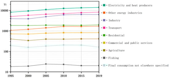 Rapid temperature change has become an important environmental issue worldwide and poses a major threat to human survival and development. Most scholars believe that the rapid increase in emissions resulting from high-carbon development patterns is the main cause of temperature rise. Therefore, the international community has adopted various measures to control emissions. However, some experts have pointed out that the control of emissions at a technical level alone cannot promote the transformation of society as a whole towards low-carbon, efficient, and sustainable development. To fundamentally reduce emissions, the current high-carbon development model needs to be changed, and industries need to be “unlocked” from the high-carbon development model to facilitate the implementation of a low-carbon economy. Currently, industry, energy and power, and transport are important sources of emissions (see Figure 1) [1].