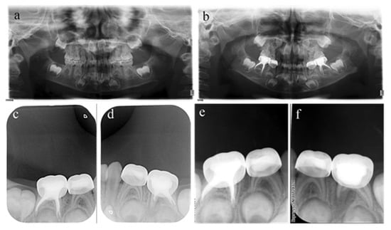 #75 and #85 were treated with pulpectomies under DGA with a 17-month follow-up period (42-month-old female child). (a) Preoperative panoramic radiographic showed no periapical radiolucency. (b) Two weeks later, the postoperative radiographs showed optimal filling in both teeth; (c) Nine months after treatment, the radiograph showed nothing abnormal in #85. (d) Nine months after treatment, the filling paste in the root canal of #75 showed partial resorption. (e) Seventeen months after treatment, the radiograph showed nothing abnormal in #85. (f) Seventeen months after treatment, the filling paste in the root canal of #75 was completely resorbed. Radiolucency was seen around the mesial root as well as pathological root absorption. The pulpectomy in #75 failed but succeeded in #85.