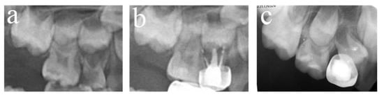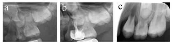 #54 received pulpectomies under DGA with a 34-month follow-up period (65-month-old male child). (a) The preoperative radiograph revealed periapical radiolucency surrounding #54. (b) Radiograph taken one week postoperatively showing overfilling in the buccal root canals. (c) Twenty-six months after the operation, the root was completely absorbed, and the eruption direction of #14 was altered. Pulpectomies in #54 failed.