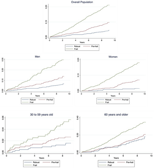 During an 8.9-year median follow-up (interquartile range: 8.6–9.0), 308 individuals died (11.5%). Kaplan–Meier failure estimates by frailty status for the general population and stratified by sex and age group are shown in Figure 2. Briefly, for all the groups, lower survival rates in frail and pre-frail individuals compared to robust were observed (log-rank < 0.001).