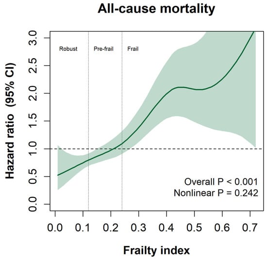The non-linear association between the continuous FI score and all-cause mortality is shown in Figure 3. Overall, a higher FI score was associated with a higher risk of mortality (overall p < 0.001). No evidence of non-linearity was observed in the spline.