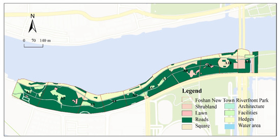 This paper selected the New City Riverfront Park in Shunde District, Foshan, China (Figure 1), and the Qiandeng Lake Park in Nanhai District, Foshan, China (Figure 2), as sample sites. Both are located within the ecological space of Foshan City’s “Qianmu Park Ring” planning document. Foshan City published the “Special Plan for the Construction of Natural Ecological Civilization in Foshan City” in 2018, which proposed the construction of a multi-level life synergistic natural ecological pattern consisting of three screens, six wedges, two veins, two rings, and two networks. Given that the city of Foshan owns Qianmu Park Ring, a significant ecological space, the two riverfront spaces must be situated in an ecologically sensitive area. While NEQ plays a vital role in ensuring the ecological quality of the Qianmu Ring of urban parks in the city, the two sample sites are urban public spaces that must provide RS for their residents. Qiandeng Lake Park is a typical urban waterfront park with its narrow north–south water surface and connection to the Foshan waterway. New Town Riverfront Park was designed and constructed along the Tanzhou waterway and is a standard strip of waterfront space. The two sites are surrounded by residential land and are situated in densely populated regions with the activity of waterfront spaces, typical waterfront landscapes, and more extensive services. In this regard, it is appropriate to research the vitality factor of waterfront space quality and propose spatial optimization strategies to address this issue.