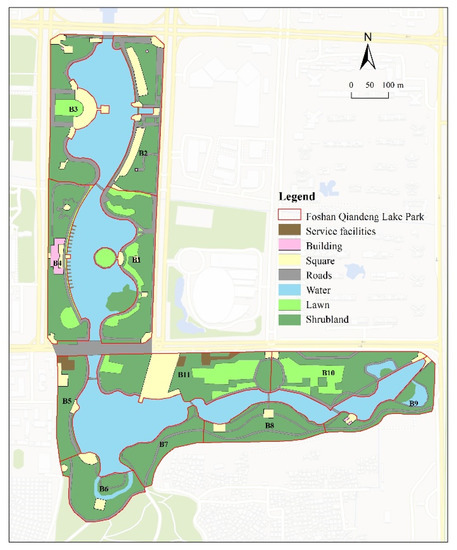 Landscape distribution map of Qiandeng Lake Park in Nanhai District, Foshan City.