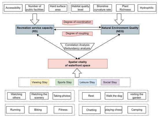 (1) The vitality of waterfront spaces is primarily determined by RS capacity (accessibility, number of public facilities) and NEQ (plant richness, shoreline curvature). RS is essential for a social stay, while NEQ is more appealing for a viewing stay. There is a positive correlation between the degree of ecological–recreational coupling and social stay.