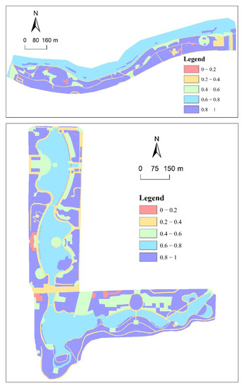 Habitat quality level is one of the effective indicators to measure the habitat quality and degradation level of the landscape based on land cover. Creating and maintaining natural habitats is one of the most critical methods for attracting visitors and increasing their propensity to stay in the park. A complete ecological space is conducive to adjusting the microclimate of the waterfront space on the one hand, and it enhances people’s aesthetic perceptions on the other hand. The treatment of the shoreline is closely related to the waterfront’s viability and making it one of the most desirable places for tourists to stay. As a means of enhancing the accessibility of the transitional shoreline, the convex treatment can lengthen the shoreline. In contrast, the concave treatment can attract people’s attention and encourage them to enter the waterfront area [34]. Foshan Qiandeng Lake Park, for instance, can diversify its shoreline treatment, and each shoreline can attract visitors to stay (Figure 9).