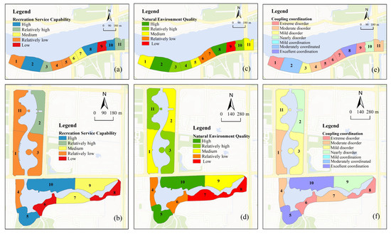 (a,b) Recreation service capacity. (c,d) Natural environment quality. (e,f) Coupling and coordination capacity.