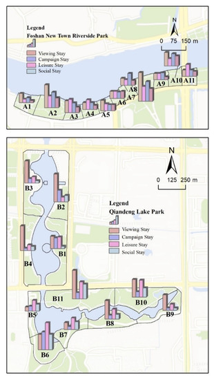 In order to assess the level of attraction of various waterfront spaces, it is necessary to observe the number of people staying in each space. A8 (18.7%) and A2 (14.8%) had the highest stay percentage across the entire A space sample section. Sample A8 includes a larger square to create a spatial enclosure, resting seats, and a lawn for visitors to sit on to feel safe and comfortable during their stay. It helps visitors feel protected and offers privacy for viewing and leisure activities. The hedge along the shoreline of sample A2 is shorter than that of sample A1; consequently, the view of the river becomes more expansive, enticing people to stay and take photos of the scenery. We discovered that B6 (16.09%), B2 (10.73%), and B11 (14.12%) had significantly higher stay rates than any other B space. Sample B6 provides more leisure time due to its abundance of trees, which provide visitors with shady and cool resting areas during the summer. Sample B2 has an attractive promenade intended to entice visitors to congregate and stay; sample B11, which serves as the park’s main entrance, has a large open square, a smaller square with shade trees, and water spraying facilities to entice visitors to stay for longer periods. In general, there are significant differences between the types of stays in the samples (Figure 6), with viewing stays > leisure stays > sports stays > social stays in terms of the activities that occur during these stays. Sample squares A8, B6, and B11 had an overall higher level of attractiveness than sample squares B9, A9, and A1.