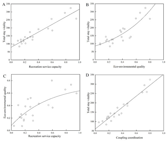 Results of fitting spatial characteristics of waterfront with spatial vitality values. (A) The llinear fitting between total stay vitality and RS; (B) The llinear fitting between total stay vitality and eco-environmental quality; (C) The llinear fitting between eco-environmental quality and RS; (D) The llinear fitting between total stay vitality and coupling coordination.