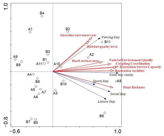 The fitting matrix correlation relationship of multivariate multiple linear regression was further demonstrated, and the redundancy analysis model (RDA) [31] of NEQ, RS, NEQ and RS coupling coordination, and spatial vitality characteristics was developed. Red arrows represent waterfront spatial characteristics, blue arrows represent stay attractiveness, and black circles represent samples. There was a positive and negative correlation between waterfront spatial features and stay attractiveness in the quadrant where the arrow is located. The ray length indicates how strongly correlated a certain waterfront spatial feature factor was with stay attractiveness; the longer the ray extends, the stronger the correlation, and vice versa. The graph shows that the NEQ, ecology–recreation coupling degree, and RS (hard surface area, recreation facilities) are all in the same quadrant. The ray extension is long, and the angle is small, indicating a strong positive correlation between the factors. There was also a strong positive correlation between these spatial characteristics and the overall attractiveness of the waterfront. A direct relationship existed within a specific range of values between waterfront spatial vitality and waterfront spatial characteristic values such as NEQ, ecology–recreation coupling degree, and RS. Moreover, the viewing stay strongly correlated with shoreline curvature and habitat quality in the first quadrant. In the fourth quadrant, plant richness strongly correlated with sports stay and social stay (Figure 8).