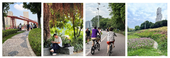 The social behavior stay activities in Foshan City’s waterfront space can be classified into four groups: viewing stay, sports stay, leisure stay, and social stay. The viewing stay includes people watching, sightseeing, and photography (cell phones, drones); the sports stay includes running, cycling, and fitness (playing swords, shuttlecock, badminton, and basketball); the leisure stay includes resting (taking a cool break, dining, and drinking), walking dogs, and visiting the garden; and the social stay includes conversing, playing chess, and camping.