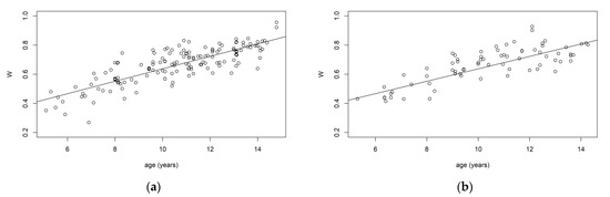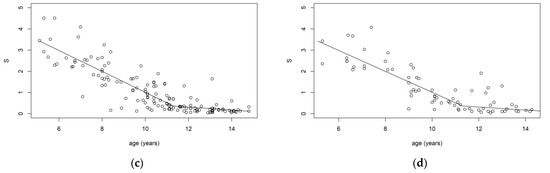 The relationship between chronological age and the hand–wrist maturation index was almost linear, as shown by Cameriere [1]. For that reason, we assumed that the location parameter of distribution of followed a simple linear model. On the contrary, the relationship between chronological age and dental maturation, in early stages of life, is not linear (Ferrante [7]) and it can present one or more breakpoints, i.e., points where the relationship changes abruptly. This kind of relationship may be specified in several ways; we modelled as a segmented function with one breakpoint (Bucci [8]). To this end, the authors investigated a broken-line relationship between and age (), following the approach proposed by Muggeo [16].