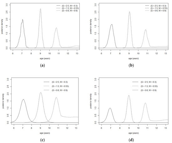 Posterior age distribution for given values of S and W with a Rotated Clayton (90°) model in the validation sample. (a) S and W normally distributed. (b) S and W asymmetric Laplace distributed. (c) S asymmetric Laplace distributed and W normally distributed. (d) S normally distributed and W asymmetric Laplace distributed.