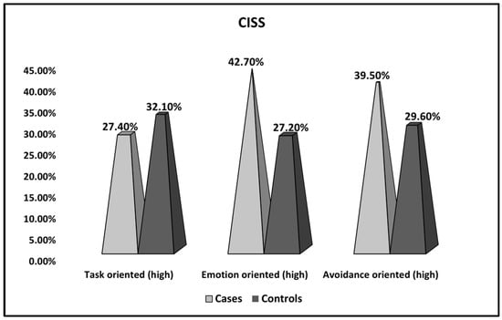 Table 3 and Figure 1 describe the comparison of CISS survey results between women with thrombophilia and recurrent pregnancy loss (cases) and women with thrombophilia and recurrent pregnancy loss who achieved a normal pregnancy and preterm or full-term birth (controls). The standardized questionnaires showed multiple significant differences between the two study groups. While examining the CISS survey results presented in Table 3 and Figure 1, it was observed that patients in the reference group were more likely to be emotion-oriented (42.7% vs. 27.2%, p-value = 0.019).