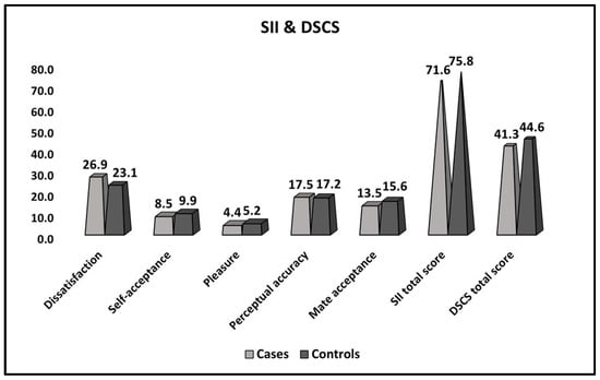 Table 4 and Figure 2 present the comparison of SII and DSCS survey results between women with thrombophilia and recurrent pregnancy loss (cases–reference group), women with thrombophilia and recurrent pregnancy loss who achieved a normal pregnancy, and preterm or full-term birth (controls). Among the significant differences, it was observed that women in the reference group had higher levels of dissatisfaction, and lower levels of self-acceptance, pleasure, and marital quality scores, while the perceptual accuracy was similar to the control group. The total sexual interaction instrument score (SII) was statistically significantly lower in the reference group (71.6 vs. 75.8, p-value = 0.003). Similar to the SII score, the dyadic sexual communication total score (DSCS) was significantly lower among those who failed to give birth (41.3 vs. 44.6, p-value = 0.002).