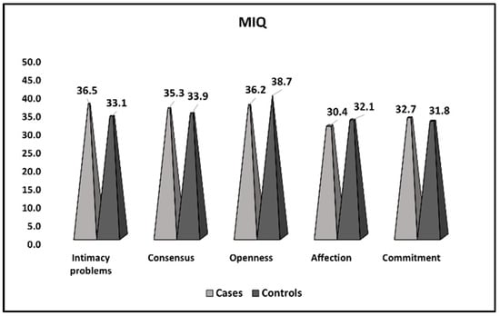 Table 5 and Figure 3 describe the comparison of MIQ survey results between women with thrombophilia and recurrent pregnancy loss (cases) and women with thrombophilia and recurrent pregnancy loss who achieved a normal pregnancy and preterm or full-term birth (controls). It was observed that women from the reference group had significantly bigger intimacy problems and lower openness scores than women in the control group (36.5 vs. 33.1, p-value = 0.008), respectively (36.2 vs. 38.7, p-value = 0.019). Consensus levels, affection, and commitment were similar in both study groups.