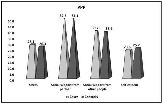The prenatal psychosocial profile was analyzed between women with thrombophilia and recurrent pregnancy loss (cases), women with thrombophilia and recurrent pregnancy loss who achieved a normal pregnancy and preterm or full-term birth (controls), and presented in Table 6 and Figure 4. It was observed that social support from partners and from other people was equivalent in both groups, although stress levels were significantly higher in the reference group (28.1 vs. 26.3, p-value = 0.004), respectively, self-esteem levels were significantly lower (23.6 vs. 25.2, p-value = 0.020).