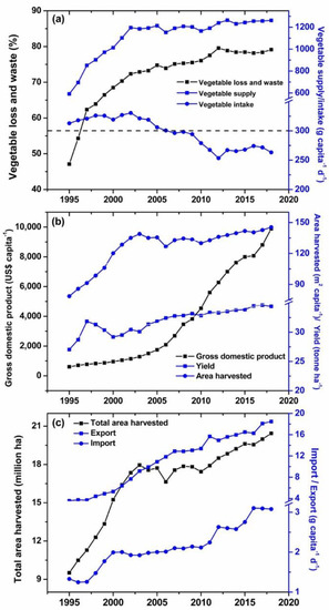 The supply, intake, loss and waste (a), area harvested per capita, yield, area harvested per country (b), import and export of vegetables, and gross domestic product (c) in China from 1995 to 2018. Data are collected from the National Statistics of China except for the data on vegetable import that originated from the FAO database. The dot-line in Figure 1a represents the recommended value of vegetable intake by the EAT-Lancet Commission [20].