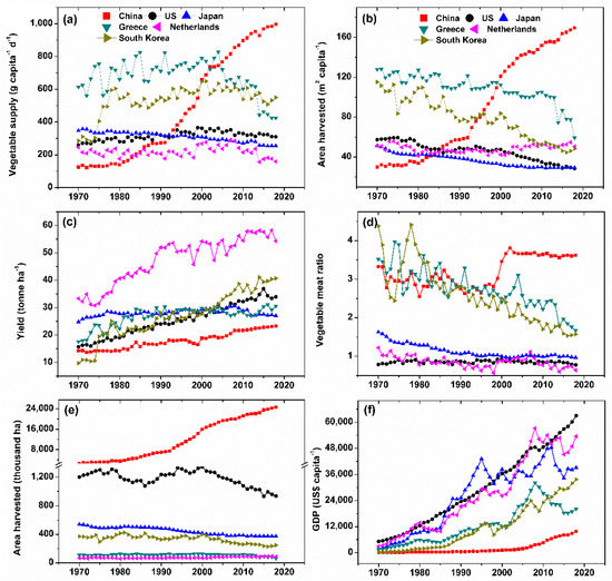 The vegetable supply (a), area harvested per capita (b), yield (c), vegetable to meat ratio (d), total area harvested per country (e), gross domestic product (GDP) (f) of China, United States, Japan, Greece, Netherlands, and South Korea from 1970 to 2018. Data originated from the FAO database. The vegetable–meat ratio is the ratio of the quantity of vegetable supply to that of meat plus fish.