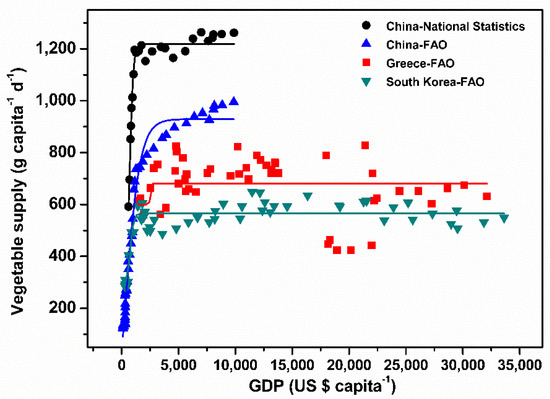 Regardless of the National Bureau of Statistics of China or FAO data, the curve fitting showed that vegetable supply across China, South Korea, and Greece increased by increased GDP per capita and kept constant roughly from 2500 US$ capita−1 (Figure 3 and Table 1). Vegetable supply in China peaked at 1219.0 g capita−1 d−1 based on data from the National Bureau of Statistics of China and peaked at 929.1 g capita−1 d−1 based on FAO, whilst those of South Korea peaked at 681.1 g capita−1 d−1, and Greece peaked at 565.2 g capita−1 d−1.