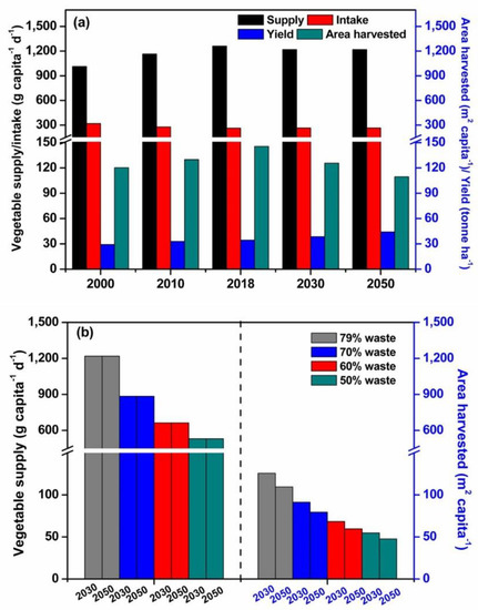 The supply, intake, area harvested per capita, and yield of vegetables in China in 2000, 2010, 2018, and the predicted 2030 and 2050 (a), the vegetable supply and area harvested per capita considering the various scenarios of vegetable loss and waste of 70%, 60%, and 50%, as predicted in 2030 and 2050 (b). Data are collected from the National Statistics of China.