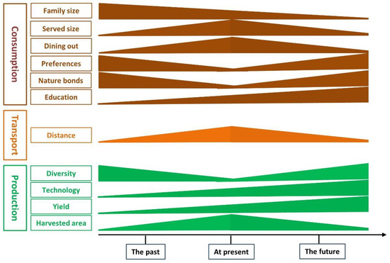 The production, transportation, and consumption of vegetables at three-time scales (the past, at present, and the future) in China. Vegetable production is gradually shifted from area dependent to yield-dependent by using advanced technology. The loss and waste of vegetables are increased due to the excessive cultivation area, long transportation, small family size, and decreased people’s preference for vegetables. The increase in vegetable intake, together with less loss and waste in the future, can be achieved by more education on the vegetable diet from either a health or environmental perspective, closer bonds with vegetable plants and nature, increased vegetable diversity, shortening the distance of vegetables from the fields to tables, modified dietary pattern (smaller served size and less waste on tables from dining out), and using modern technology.